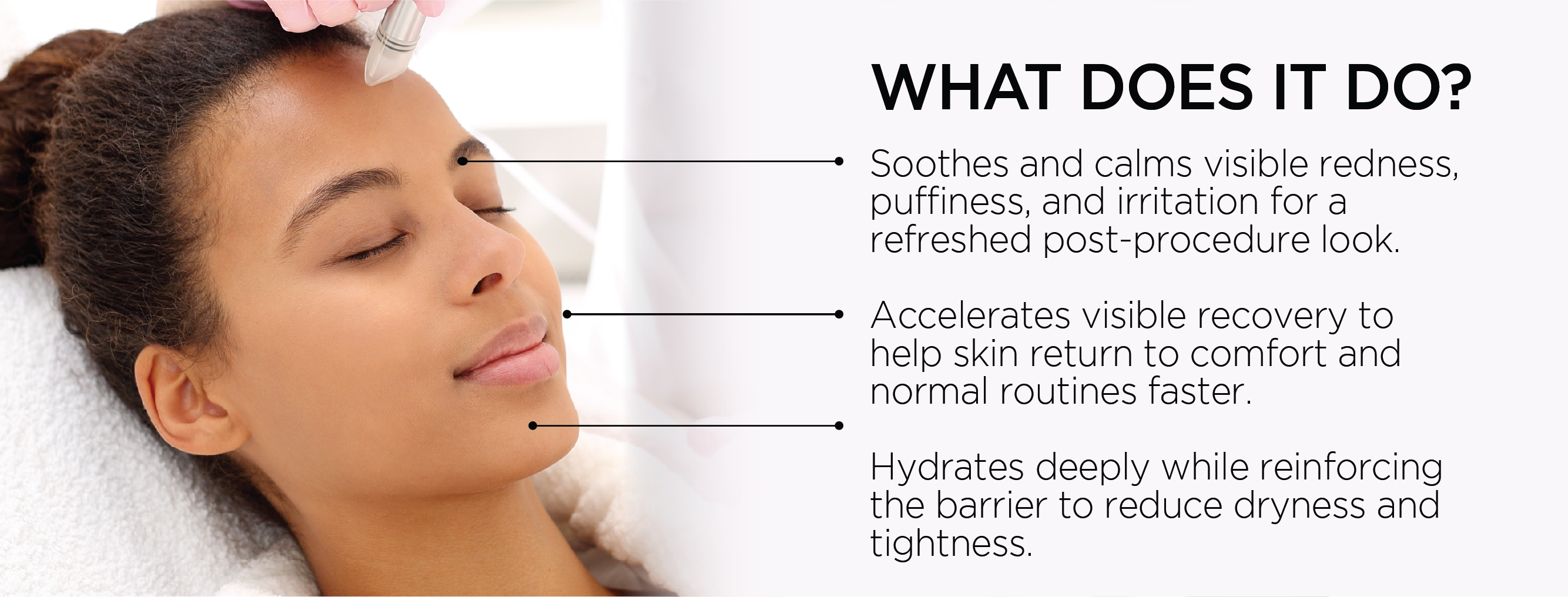 - Soothes and calms visible redness, puffiness, and irritation for a refreshed post-procedure look.