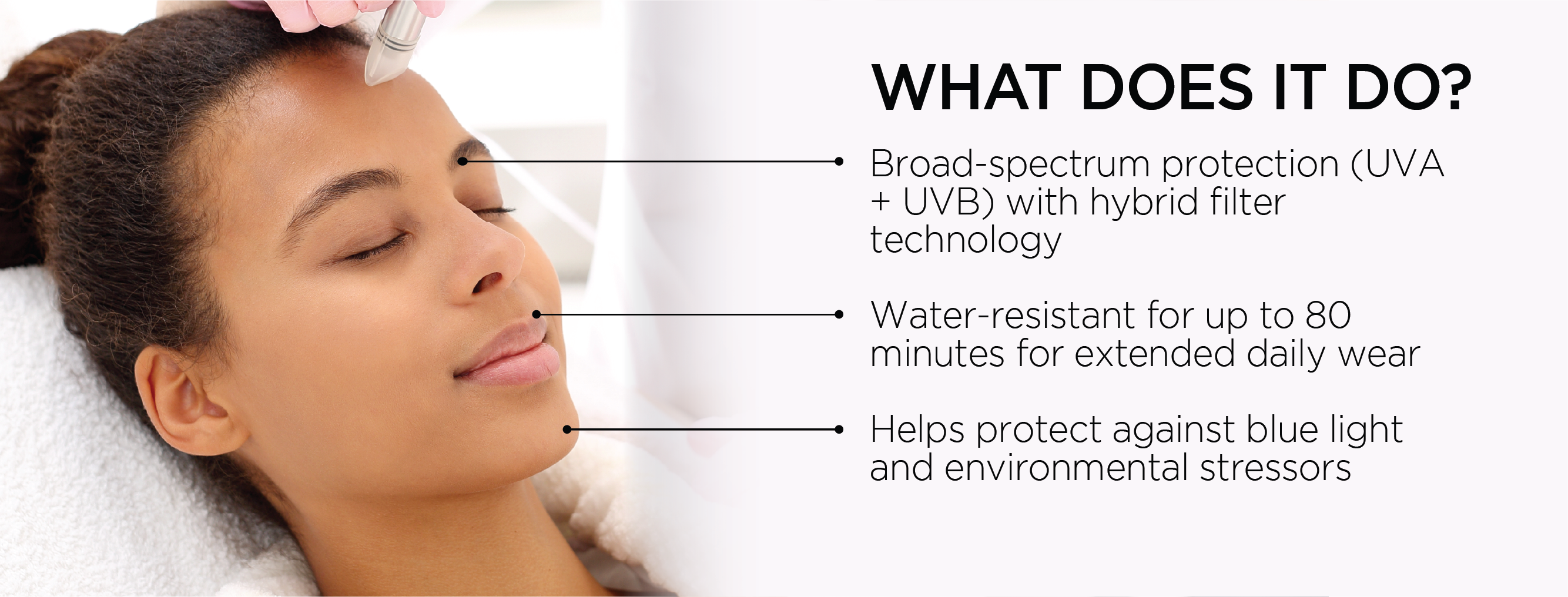 - Broad-spectrum protection (UVA + UVB) with hybrid filter technology