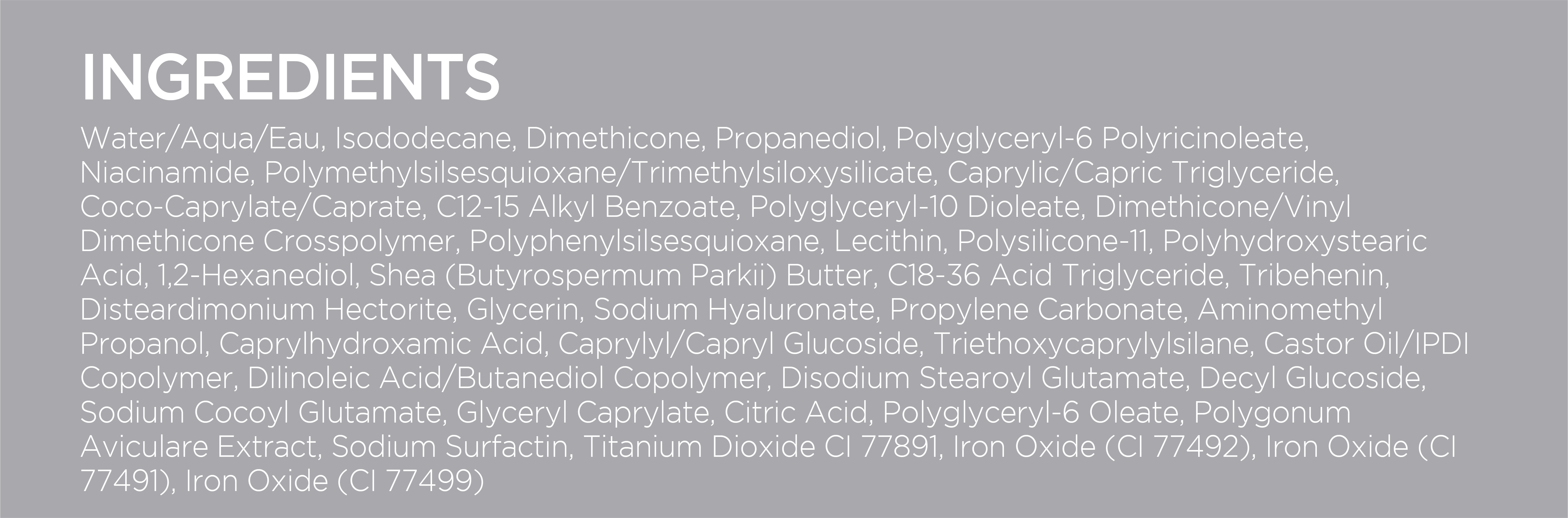 Ingredient Highlights: Niacinamide, Sodium Hyaluronate, Polygonum Aviculare (Knotweed) Extract, Iron Oxides